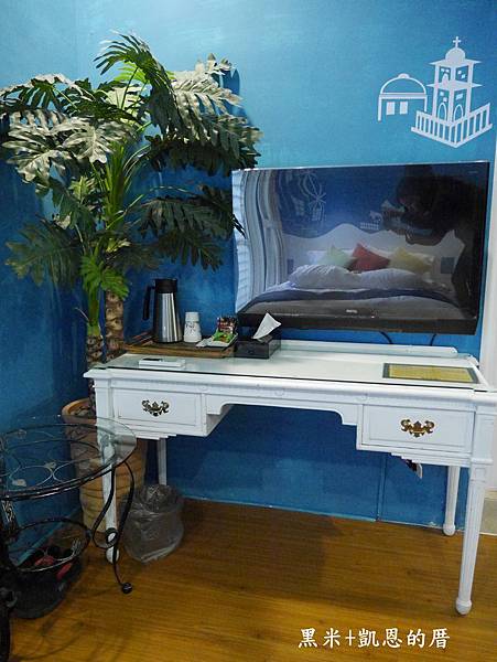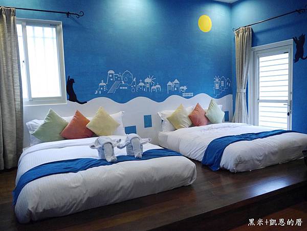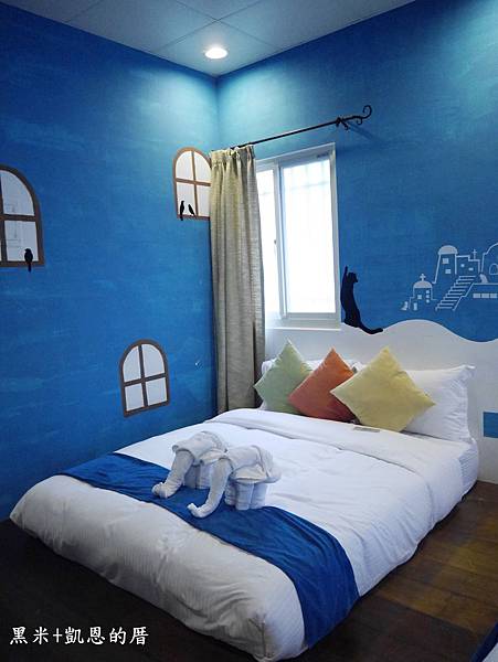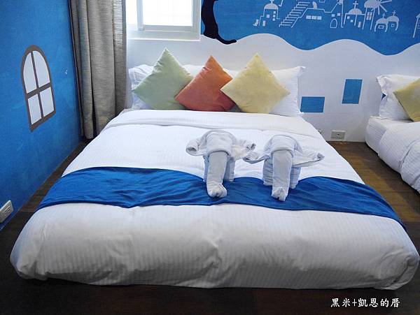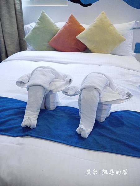 整間房間以寶藍色為基調,搭配彩色的抱枕,床上還有兩隻大象迎接